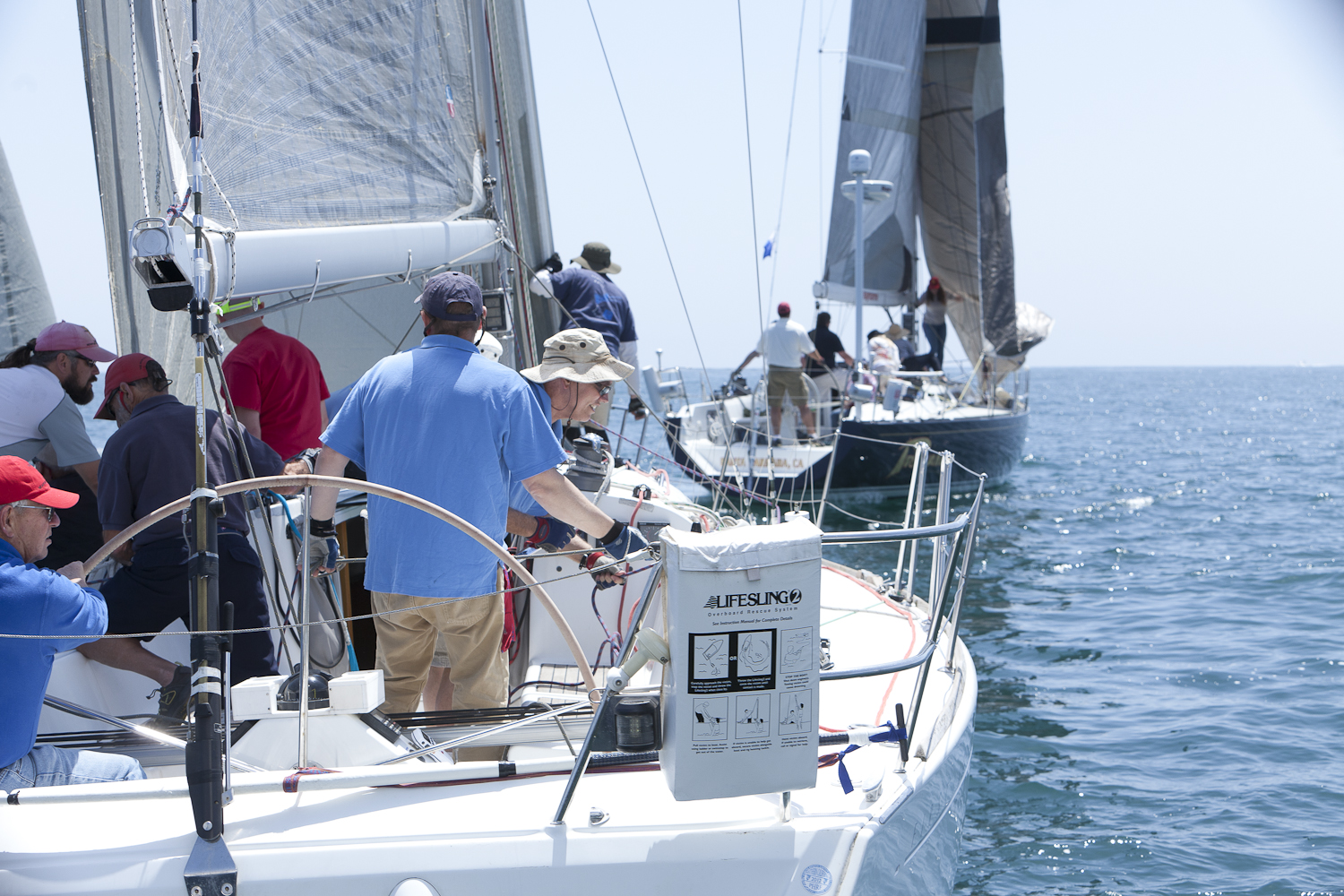 We were short-handed by two, including Trophy Wife. Short-winded too, of course: 15 knots before the start, but tapered off to under 10 for much of the race. Wind was more southerly, which reduced the final windward leg to the finish to a close, close reach. Two yachts exchanged paint and shouts minutes before the start. (Not ours!)